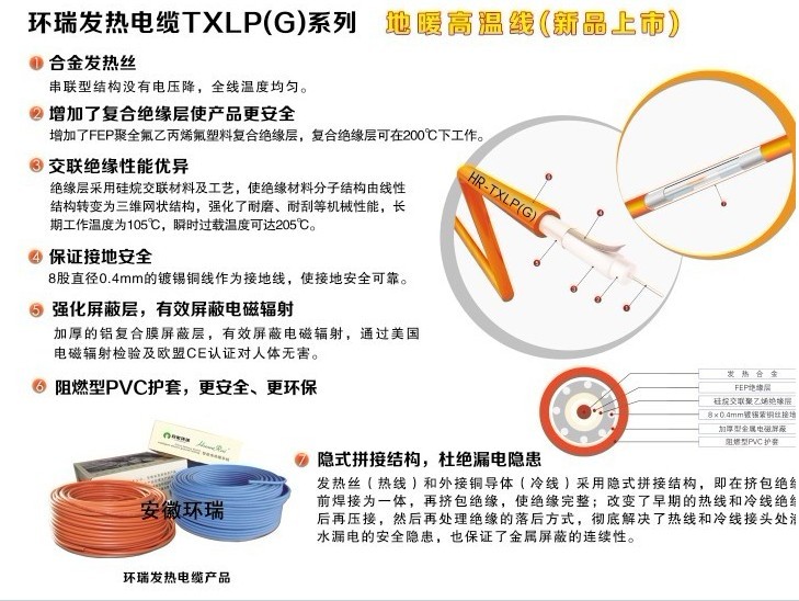 采用雙層絕緣、隱式拼接,包括多股發(fā)熱合金,所述的發(fā)熱合金外依此包覆無色透明氟隆絕緣層、火焰及蒸汽交聯(lián)聚乙烯絕緣層、8*0.4mm鍍錫紫銅絲接地、加厚型金屬電磁屏蔽,阻燃型PVC外護套。