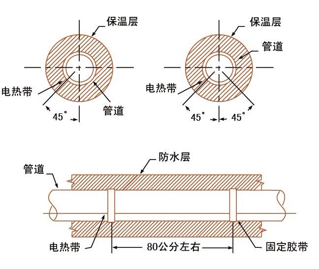 電伴熱系統在包括供電系統,電熱帶及相關配件完成后,經過調試確定正常使用后,并不是保證整個工程的結束。為了保證系統的供熱效果,后續工作有:進行外保溫安裝,然后在對電伴熱再次檢查,做到最后的安全確認,根據現場選擇符合環境的保溫材料。嚴格按照設計要求,不允許擅自變更保溫作法。具體要求如下: