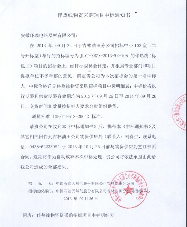 此次成功競標吉林油田,也是甲方在去年使用過我司的電伴熱帶后做的慎重選擇,是對于我司電熱帶產品質量的主要肯定。 本次項目包括自限溫、恒功率電熱帶兩大系列。目前正在緊張的進行后續的項目合作中。以下為環瑞中標通知書