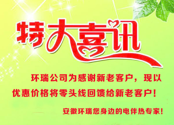 為感謝新老客戶對環瑞公司發展給予的支持,現有零頭線將以優惠價回饋給新老客戶,歡迎廣大新老客戶咨詢訂購,環瑞十年專注電伴熱產品研發,品質保證。