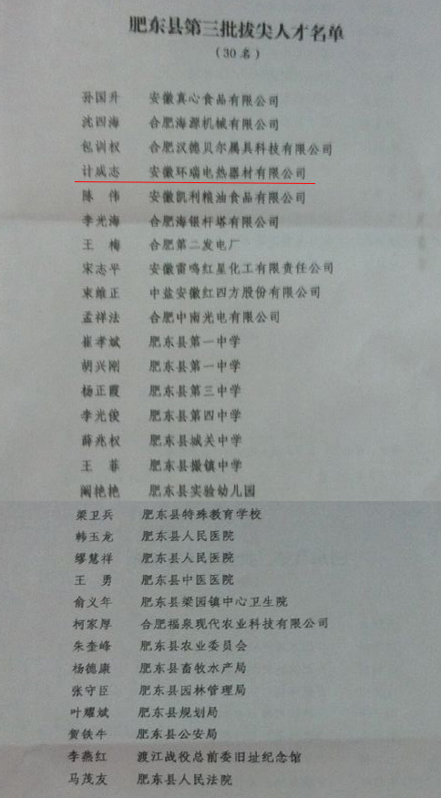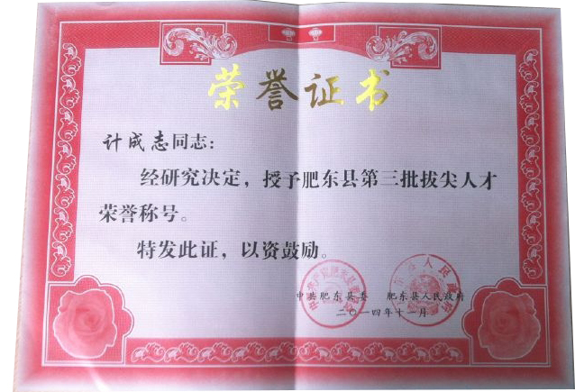 肥東縣委、縣政府為表彰環(huán)瑞公司對(duì)肥東縣當(dāng)?shù)亟?jīng)濟(jì)發(fā)展所作的貢獻(xiàn),特授予環(huán)瑞董事長(zhǎng)計(jì)成志“肥東縣第三批拔尖人才”榮譽(yù)稱(chēng)號(hào)。